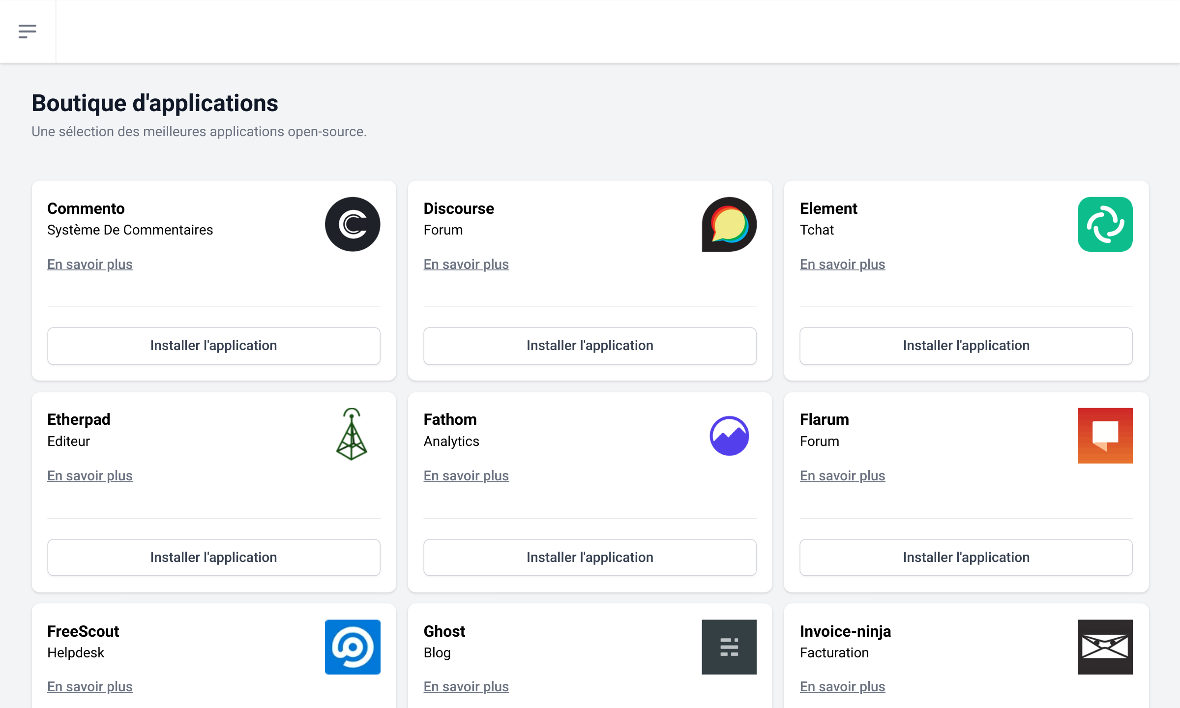 Ethibox travaille pour vous et vous laisse libre de vous concentrer sur vos applications principales. Accédez à 66 applications open-source à installer en 1 clic.